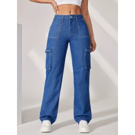 Plain Flap Pockets Cargo Pants, Loose Fit Y2K & Kpop Style Straight Jeans, Women's Denim Jeans & Clothing